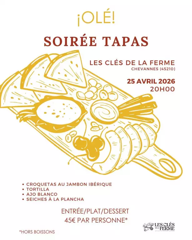Réservez votre soirée Tapas aux Clés de la Ferme à Chevannes ! Soirée ibérique avec au menu : croquetas au jambon, tortilla, ajo blanco et seiches à la plancha