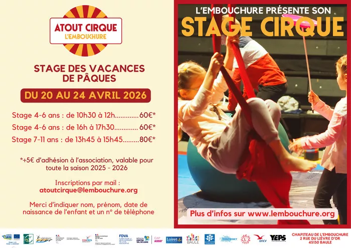 Envie de voir vos enfants s'épanouir, jongler et s'envoler ? Le stage Atout Cirque revient du 20 au 24 avril 2026 à Baule ! Que ce soit pour une première découverte ou pour se perfectionner, nos ateliers sont adaptés à chaque âge : 4-6 ans : Le matin (10h30-12h) ou l'après-midi (16h-17h30) — 60€\* 7-11 ans : De 13h45 à 15h45 — 80€\* Lieu : Chapiteau de l'Embouchure (2 rue du Lièvre d'Or, 45130 Baule). INSCRIPTIONS : [atoutcirque@lembouchure.org](mailto:atoutcirque@lembouchure.org) ️ Places limitées, ne tardez pas à réserver !...