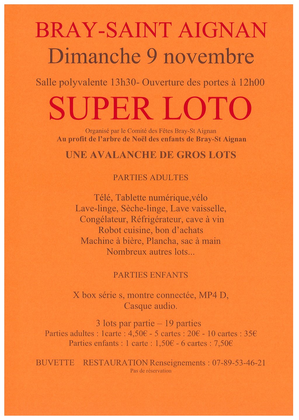 Super Loto - Salle polyvalente de Bray Saint Aignan - 09/11/2025 à 13:30 - Parties Adultes : 4.50€/carte - 20€/5 cartes - 35€/10 cartes Parties Enfants : 1.50€/carte - 7.50€/6 cartes