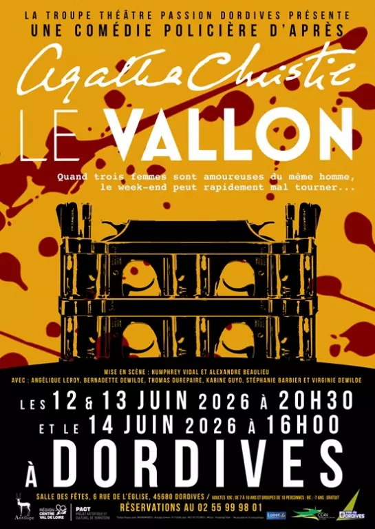 A l'approche de l'été venez vous régaler avec une pièce d'Agatha Christie "Le Vallon" mise en scène par Humphrey Vidal et Alexandre Beaulieu et présentée par la troupe Passion Théâtre de Dordives ! Quand trois femmes sont amoureuses du même homme, le week-end peut rapidement mal tourner... Sur réservation par téléphone