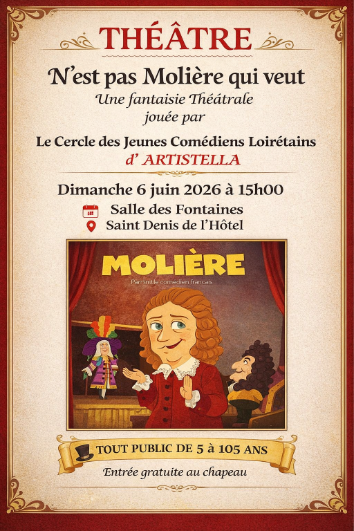 "N'est pas Molière qui veut", une fantaisie théâtrale jouée par Le Cercle des Jeunes Comédiens Loirétains d'Artistella. Tout public : de 5 à 105 ans