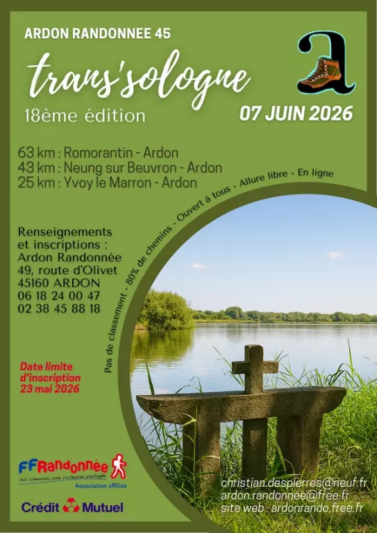Le dimanche 7 juin 2026, rejoignez la Trans’Sologne pour une immersion nature au cœur de la Sologne 🌿 📍 Départs vers Ardon avec plusieurs parcours au choix : ➡️ 63 km – Romorantin → Ardon ➡️ 43 km – Neung-sur-Beuvron → Ardon ➡️ 25 km – Yvoy-le-Marron → Ardon 🌳 80% de chemins pour une expérience 100% nature 🚶♂️ Ouvert à tous – allure libre 💻 Inscription en ligne 📅 Pensez à vous inscrire avant le 23 mai ! 👉 Que vous soyez randonneur confirmé ou simple amoureux des grands espaces, venez relever le défi et profiter des paysages uniques de la Sologne !
