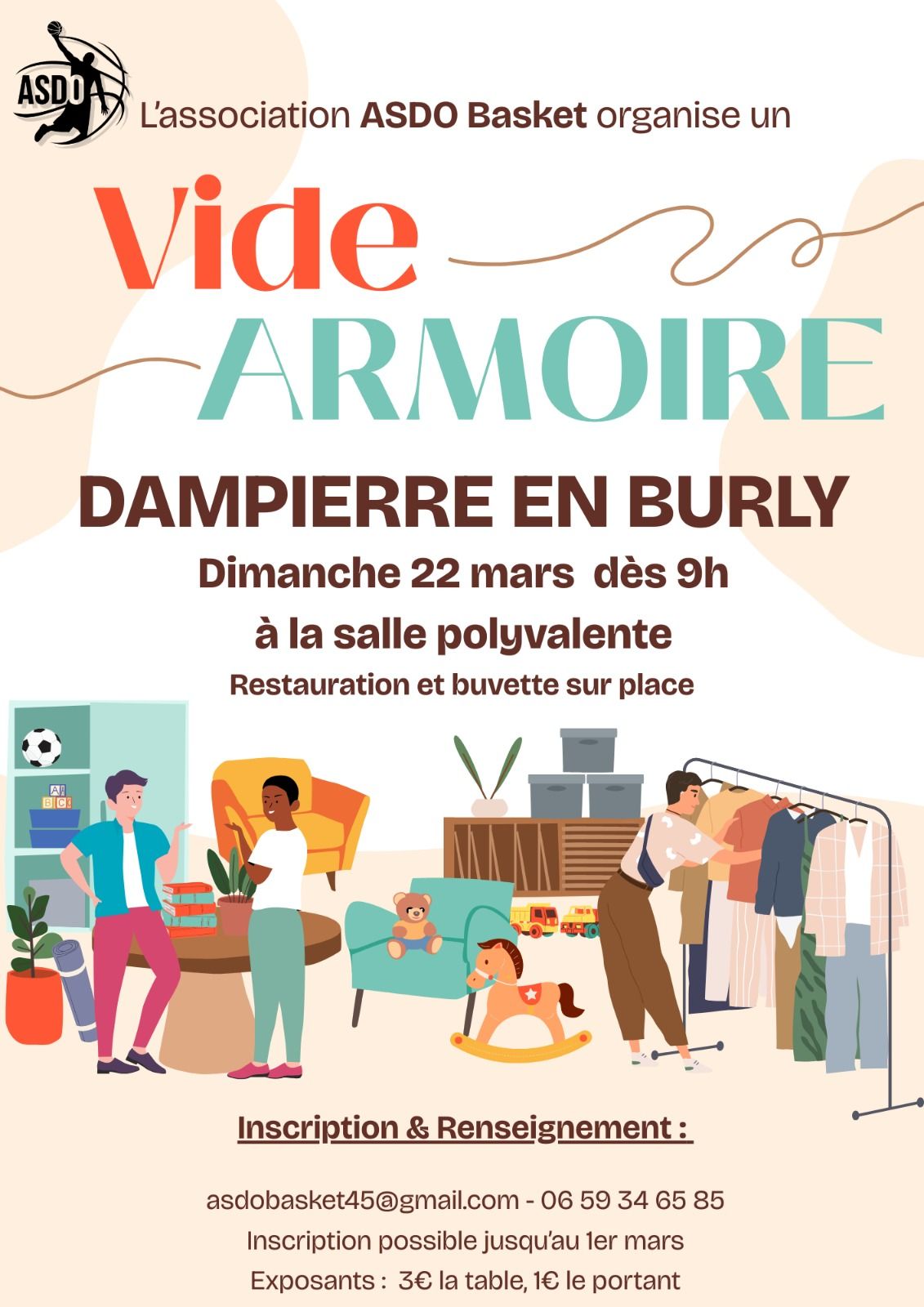 L'association de basket Dampierre-Ouzouer organise son vide-armoires ! Besoin de faire de la place dans les placards ou envie de faire de bonnes affaires ?! Exposants et visiteurs sont attendus nombreux pour ce grand déballage. Inscriptions exposants avant le 1er mars. Restauration & buvette sur place. - Par l'ASDO Basket -