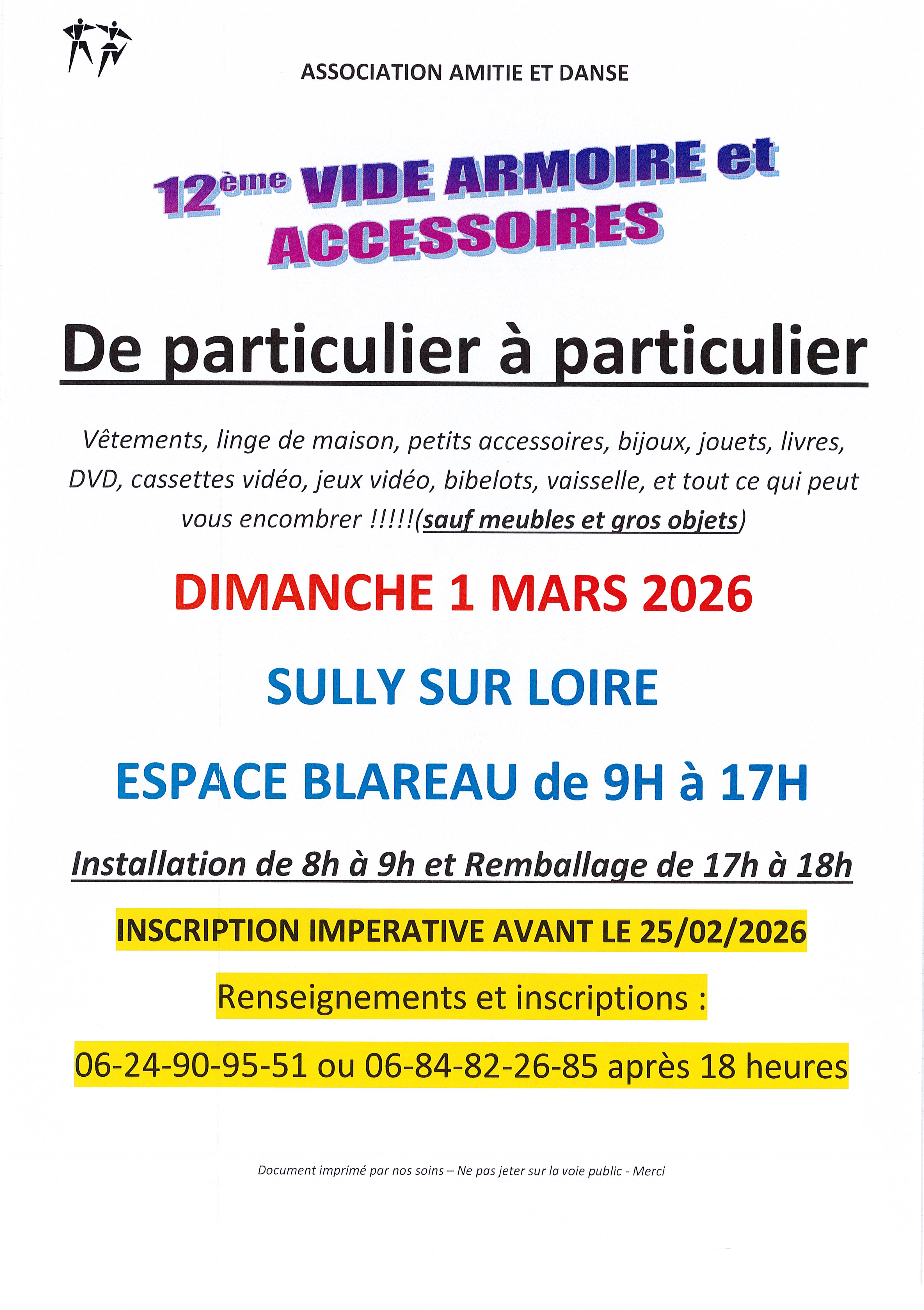 L'association "Amitié et danse" organise son 12è vide armoires ! Vêtements, jouets, chaussures, accessoires, bibelots, livres, linge de maison... Hors meubles et gros objets. Sur réservation obligatoire avant le 25 février 2026.