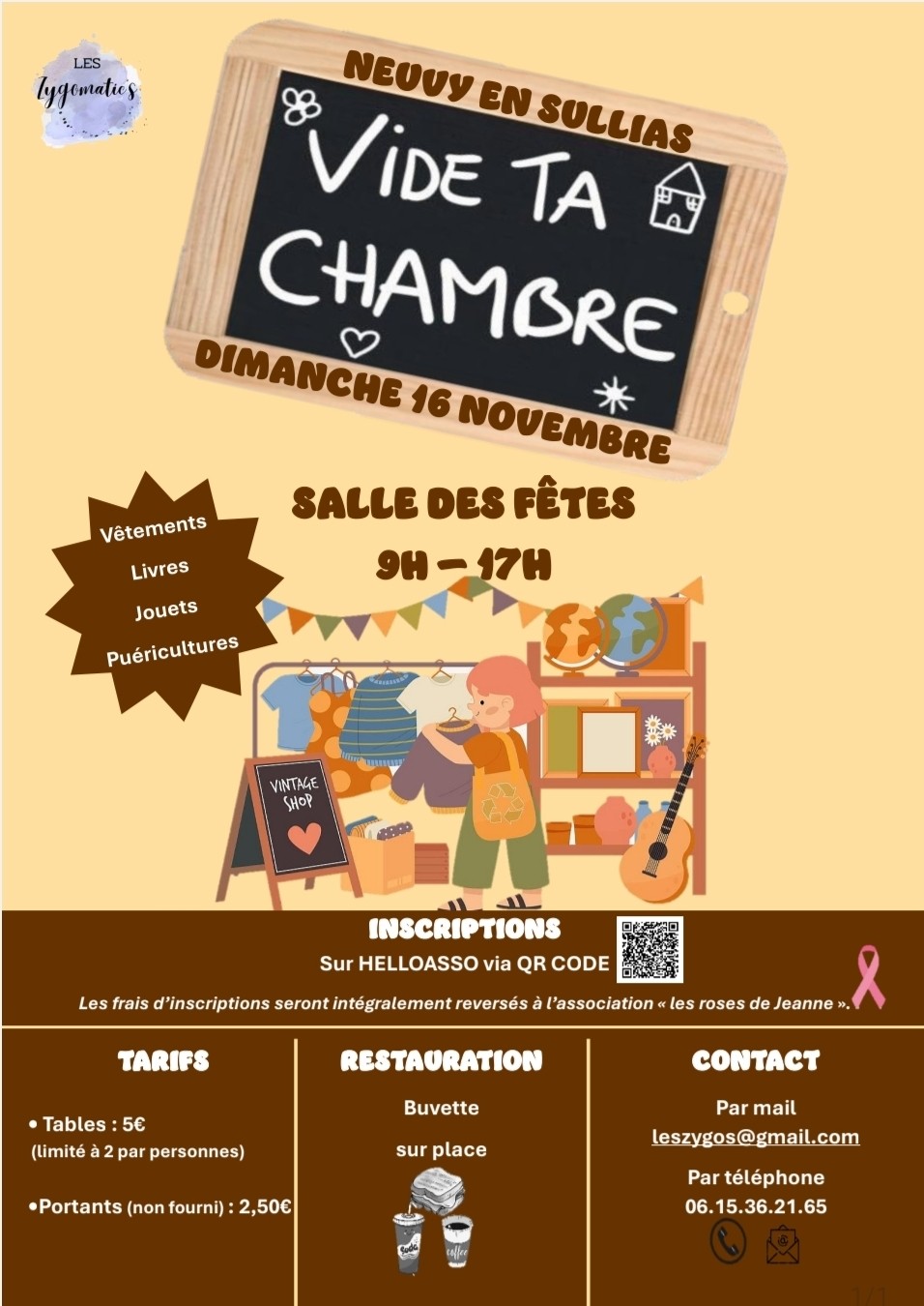 Besoin de place dans tes placards ? Offre une seconde vie à tes jouets, tes vêtements, tes livres en les vendant au vide ta chambre des Zygos ! Les bénéfices de l'opération seront reversés à l'association les roses de Jeanne de Gien dans le cadre de la lutte contre le cancer du sein. Sur place et sans réservation, possibilité de formules repas ou buvette / snack à la carte (Dans la limite des stocks disponibles)
