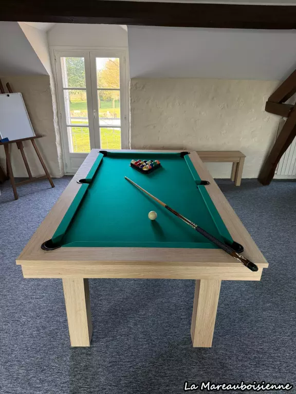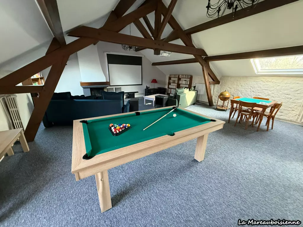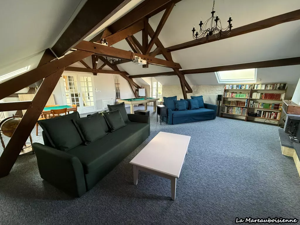 Au rez-de-chaussée : pièce à vivre de 55 m² avec grande baie vitrée sur le jardin, salon, salle à manger avec table repas pour 12 personnes, cuisine ouverte entièrement équipée (réfrigérateur congélateur, lave-vaisselle, combiné lave linge/sèche linge, four, plaque à induction, micro-onde, cafetière filtre, nespresso, hotte...), penderie ainsi qu'un wc indépendant avec lave-mains. A l’étage entièrement climatisé : - une salle de jeux d’environ 57 m² (avec deux canapés), billard, home cinéma et table de jeux (de nombreux livres, BD et jeux sont mis à disposition, en français et en anglais) - une suite parentale avec lit 180x200 cm, salle d'eau et WC privatif avec télé grand écran et son coin bureau - deux chambres avec chacune 2 lits 90x200 cm jumelables en lit de 180x200 cm, p...