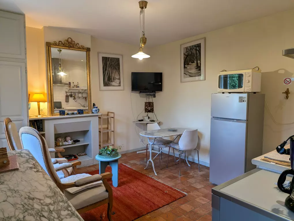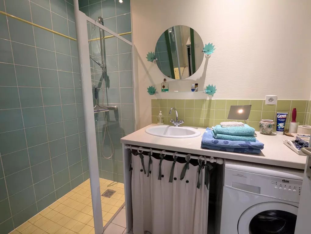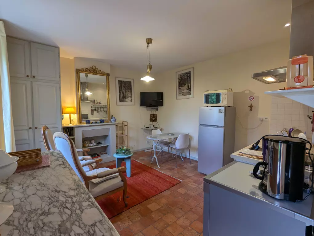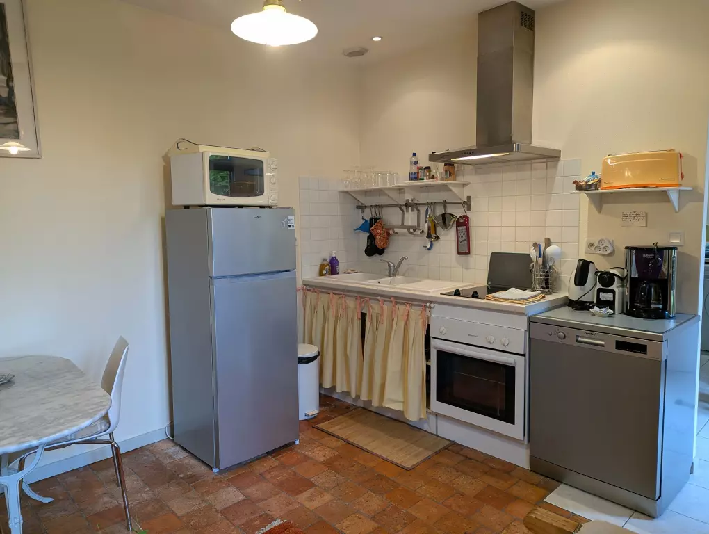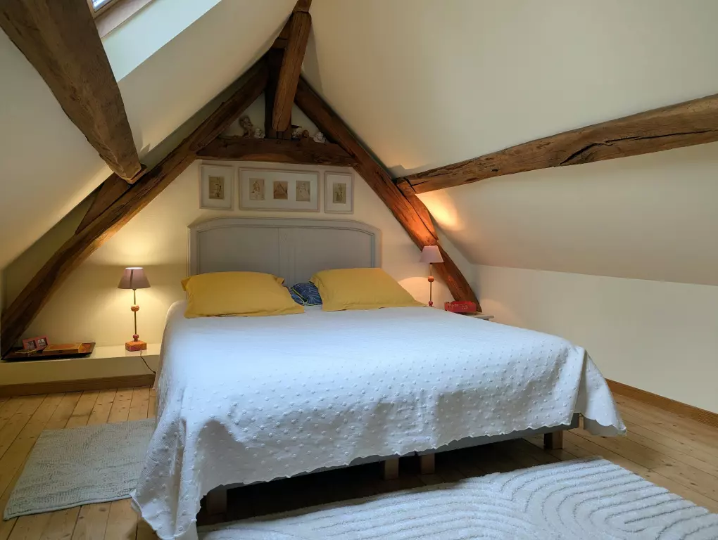 Gîte deux personnes en duplex, idéal pour un couple. Rez-de-chaussée : - séjour avec coin cuisine (réfrigérateur avec partie congélateur, évier, plaque de cuisson vitrocéramique 2 zones, four, micro-ondes, lave-vaisselle, cafetière à filtre, cafetière nespresso, bouilloire, grille-pain, mixeur), - salle d'eau indépendante (douche à l'italienne, lavabo, lave-linge) - wc séparé Étage : - Chambre sous pente en mezzanine (1 lit double 160X200). La pièce dispose d'une climatisation réversible, idéale pour un confort en tout saison. Extérieur : - Un stationnement privatif dédié au logement pour votre voiture. - Un agréable jardin clos et arboré avec salon de jardin, transats, parasol, barbecue. [i] Le tarif tout inclus comprend : le linge de lit (draps, taies d'oreille...