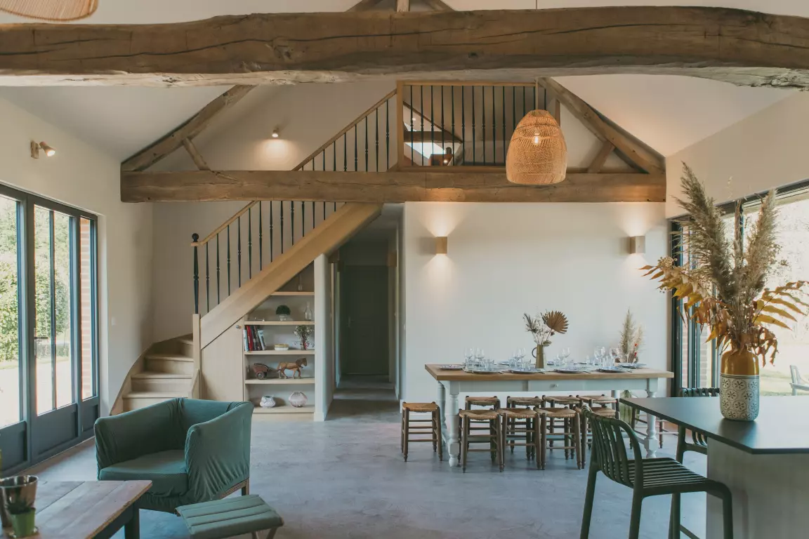 Situé en plein cœur de la Sologne, à seulement 10 minutes de La Ferté-Saint-Aubin, le Domaine du Chêne Rond vous accueille dans un cadre authentique et ressourçant. Niché au bout d’un chemin forestier, ce gîte entièrement rénové allie charme traditionnel et confort moderne, idéal pour un séjour en famille, entre amis ou pour les passionnés d’équitation. Avec son indéniable pouvoir de déconnexion, il constitue aussi le cadre idéal pour vos séminaires, journées au vert ou stages équestres. Son grand séjour cathédral et ses extérieurs privés s’adaptent parfaitement à ces moments d’échange et de convivialité. Le gîte peut accueillir jusqu’à 12 personnes et comprend : 4chambres confortables, décorées avec soin : 2 suites avec salle de bain, une chambre double, un dortoir de 4 lits simples. Une pièce de vie lumineuse avec une grande cheminée. Une cuisine ouverte toute équipée pour préparer de délicieux repas. Un espace extérieur privé avec vue sur les chevaux, terrasse, barbecue ...